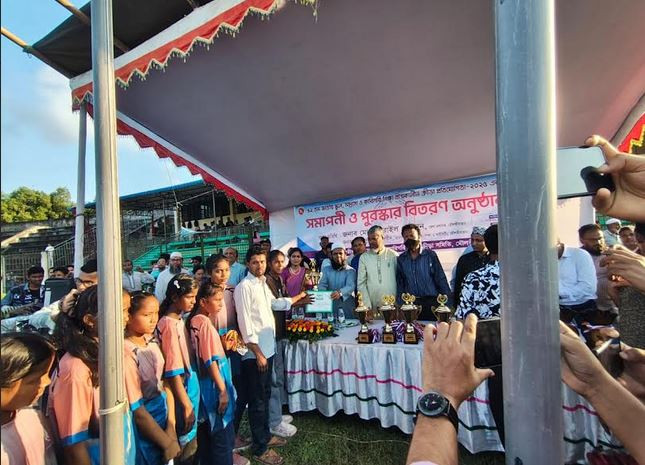 মৌলভীবাজার প্রতিনিধি \ জাতীয় স্কুল মাদ্রাসা ও কারিগরি শিক্ষা ক্রীড়া সমিতি,এর উদ্যোগে আয়োজিত (১১অক্টোবর-১২অক্টোবর) ক্রীড়া প্রতিযোগিতার সমাপনী ও পুরস্কার বিতরণী অনুষ্ঠান অনুষ্ঠিত হয়েছে। গতকাল (১২অক্টোবর) রবিবার মৌলভীবাজার এম,সাইফুর রহমান জাতীয় স্কুল মাদ্রাসা ও কারিগরি শিক্ষা ক্রীড়া মৌলভীবাজার জেলা পর্যায়ের সমাপনী খেলা পুরস্কার বিতরনী অনুষ্ঠিত হয়। অতিরিক্ত জেলা প্রশাসক (শিক্ষা ও আইসিটি) আসমা সুলতানা নাসরিন এর সভাপতিত্বে অনুষ্ঠানে প্রধান অতিথি ছিলেন জেলা প্রশাসক মো: ইসরাইল হোসেন। বিশেষ অতিথি জেলা জামায়েত এর সাধারন সম্পাদক ইয়ামীর আলী,জেলা বিএনপির আহব্বায়ক কমিটির সদস ফখরুল ইসলাম,এনসিপির নেতা এহসান জাকারিয়া,-সাংবাদিক নজরুল ইসলাম মুহিব,জেলা ক্রীড়া অফিসার মাজহারুল মজিদ। বিতরনী অনুষ্ঠানে স্বাগত বক্তব রাখেন জেলা শিক্ষা অফিসার মো: ফজলুরর রহমান। প্রধান অতিথি মূল্যবান বক্তৃতা শেষে বিজয়ীদের মধ্যে পুরস্কার বিতরণ করেন। দিনব্যাপী অনুষ্ঠিত খেলায় জমে ওঠে রোমাঞ্চকর লড়াই। ফাইনেলে নারী ফুটবলে অংশ নেয় ] মৌলভীবাজার সদর উপজেলার সেন্ট জোসেফ উচ্চ বিদ্যালয় ও এবং শ্রীমঙ্গল উপজেলার মির্জাপুর উচ্চ বিদালয়। টানটান উত্তেজনাপূর্ণ খেলায় শ্রীমঙ্গল উপজেলার মির্জাপুর উচ্চ বিদালয় নারী দলকে ২-০ গোলে পরাজিত করে মৌলভীবাজার সদর