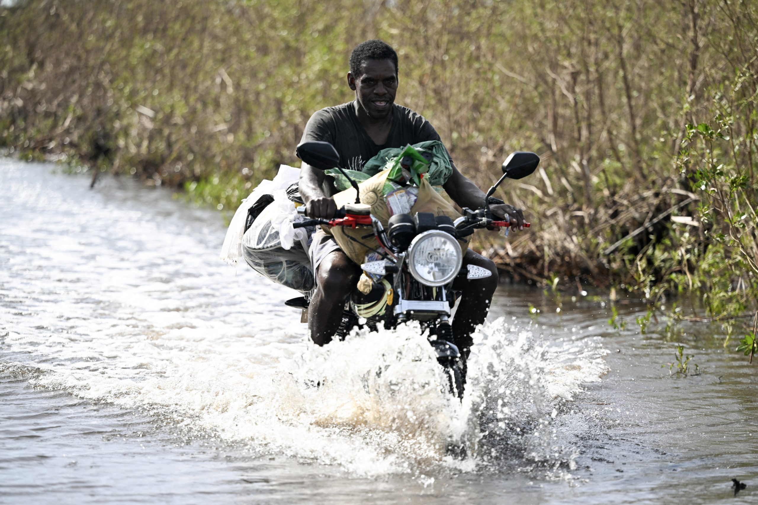 ২৯ অক্টোবর, ২০২৫ হারিকেন মেলিসার তাণ্ডবের পর ফুলার্সউড থেকে ব্ল্যাক রিভারে যাওয়ার পথে এক ব্যক্তি জলমগ্ন রাস্তা দিয়ে গাড়ি চালাচ্ছেন। (ছবি: রিকার্ডো মাকিন / এএফপি)