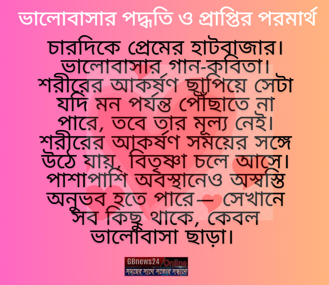 চারদিকে প্রেমের হাটবাজার। ভালোবাসার গান-কবিতা। শরীরের আকর্ষণ ছাপিয়ে সেটা যদি মন পর্যন্ত পৌঁছাতে না পারে, তবে তার মূল্য নেই। শরীরের আকর্ষণ সময়ের সঙ্গে উঠে যায়, বিতৃষ্ণা চলে আসে। পাশাপাশি অবস্থানেও অস্বস্তি অনুভব হতে পারে— সেখানে সব কিছু থাকে, কেবল ভালোবাসা ছাড়া।
