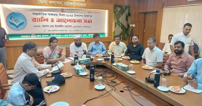 মৌলভীবাজার প্রতিনিধি \ মৌলভীবাজারে “ প্রযুক্তির যুগে স্বাক্ষরতার প্রসার, এ প্রতিপাদ্য নিয়ে মৌলভীবাজার জেলা প্রশাসন ও জেলা উপানুষ্ঠানিক শিক্ষা ব্যুরো এর আয়োজনে আন্তর্জাতিক সাক্ষরতা দিবস-২০২৫ পালিত হয়েছে। গত (৮ সেপ্টেম্বর) সোমবার এ উপলক্ষে বর্নাঢ্য র্যালি বের হয়। পরে জেলা প্রশাসকের সম্মেলন কক্ষে আলোচনা সভা অনুষ্ঠিত হয়েছে। সভায় সভাপতিত্ব করেন জেলা প্রশাসক মোঃ ইসরাইল হোসেন। বক্তব্যে তিনি বলেন, পৃথিবীর সব মানুষকে শিক্ষার আলোয় আলোকিত করার প্রত্যয়ে সচেতনতা সৃষ্টির লক্ষ্যেই মূলত এই দিনটির প্রচলন। সাক্ষরতার হার বৃদ্ধিতে সকলকে অধিক সচেতন হতে হবে। শিক্ষক লিটন পাল এর পরিচালনায় আলোচনা সভায় বিশেষ অতিথি ছিলেন অতিরিক্ত জেলা প্রশাসক (শিক্ষা ও আইসিটি ) আসমা সুলতানা নাসরিন, জেলা শিক্ষা অফিসার ফজলুর রহমান। অনুষ্ঠানে স্বাগত বক্তব্য রাখেন উপ আনুষ্ঠানিক শিক্ষা বুরো উপ পরিচালক (ভারপ্রাপ্ত) কিশোলয় চক্রবর্তী। সভায় সরকারি কমকর্তা, সাংবাদিক, শিক্ষক-শিক্ষিকা, এনজিও প্রতিনিধিসহ অন্যান্যরা উপস্থিত ছিলেন। উল্লেখ্য, ১৯৬৫ সালের ১৭ নভেম্বর ইউনেস্কো ৮ সেপ্টেম্বরকে আন্তর্জাতিক সাক্ষরতা দিবস হিসেবে ঘোষনা করে। ব্যক্তি, গোষ্ঠী ও সমাজের মধ্যে শিক্ষার প্রয়োজনীয়তা ও তাৎপর্য তুলে ধরার লক্ষ্যে এ দিবসটি নির্ধারণ করা হয়। ১৯৬৬ সালে প্রথম আন্তর্জাতিক সাক্ষরতা দিবস পালন করা হয়। প্রতি বছর এ দিবসটি উদযাপনের মধ্যে দিয়ে আন্তর্জাতিক অঙ্গনে বিভিন্ন দেশের সাক্ষরতা এবং বয়স্ক শিক্ষার অবস্থা তুলে ধরা হয়।