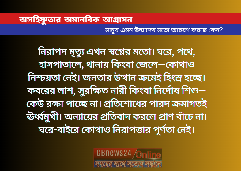 স্কুলের বন্ধুত্বে সামান্য কথা-কাটাকাটি হলেই তা হাতাহাতিতে রূপ নিচ্ছে। খুন-জখমের নজির অসংখ্য। কিশোরদের মানসিক বিকারে পাড়াপড়শি অস্থির। বন্ধু, সহকর্মী, সহযোদ্ধা কিংবা সহধর্মী—কে কার কাছে নিরাপদ? অসহিষ্ণুতার মাত্রা স্মরণকালের সব সীমা অতিক্রম করেছে। উগ্রতা এখন জাতীয় নাস্তা। কোনো বিষয়ে যুক্তি-তর্কের অবকাশ নেই। কথায় কথায় আক্রমণ। শক্তির দাপটেই শ্রেষ্ঠত্ব কায়েমের চেষ্টা। মতাদর্শের দমন থেকে আর কোনো মতাদর্শের জন্ম হয় না। দমন-পীড়ন এখন জাতীয় হাতিয়ার। বিরুদ্ধমত, ভিন্ন অবস্থান কিংবা প্রশ্ন তোলা—সবই চরমভাবে অপছন্দ। ঘুরতে যাওয়া বান্ধবী রক্ষা পায় না, ঘুমন্ত বন্ধুকেও হত্যা করে বন্ধু। সেই জাহিলিয়াতই যেন ফিরে এসেছে। নেশা ও নারী, পদ ও ক্ষমতা, কর্তৃত্ব ও অকৃতজ্ঞতার কারণে লাশের সংখ্যা বেড়েই চলেছে।