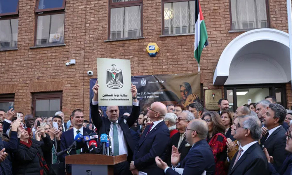 ব্রিটিশ প্রধানমন্ত্রী কেয়ার স্টারমার ফিলিস্তিন রাষ্ট্রকে আনুষ্ঠানিক স্বীকৃতির ঘোষণা দেন। তিনি বলেন, ‘মধ্যপ্রাচ্যে ভয়াবহ পরিস্থিতির মধ্যেও আমরা শান্তি ও দ্বি-রাষ্ট্রীয় সমাধানের সম্ভাবনা টিকিয়ে রাখার চেষ্টা করছি।’ ব্রিটিশ এমপি শোকাট অ্যাডাম বলেন, পতাকা উত্তোলন ঐতিহাসিক ও আবেগঘন মুহূর্ত।