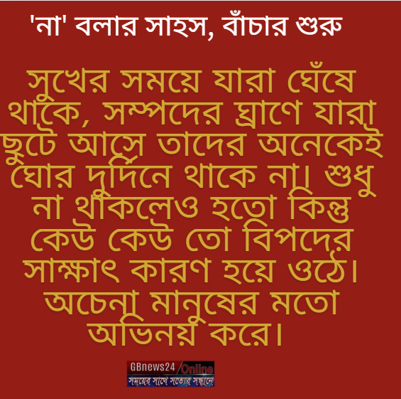 নিজের মতো বাঁচুন। শখ-আহ্লাদ পূরণ করে বাঁচুন। যা-কিছু উপভোগ করেন তা ছিনিয়ে আনুন। সামর্থ্যের সবটুকু দিয়ে আপনার ওপর থাকা অন্যের হক-অধিকার আদায় করুন। তবে কারো প্রতি কখনোই অতিরিক্ত আশা দেখাবেন না। কারো প্রতি দূর্বলতা দেখানো মানে সে আপনাকে নিয়ে খেলতে শুরু করবে। আপনার আবেগ-অনুভূতিকে পুঁজি করে তার স্বার্থ উদ্ধারের অপপ্রয়াস করবে। নিজেকে সংযত রাখুন। কারো ওপর নির্ভর না হয়ে নিজের পায়ে দাঁড়াতে চেষ্টা করুন। তবেই নির্ভার জীবনের সুখ পাবেন। সম্মৃদ্ধিতে স্থিতি হবে পথচলা। অর্থবহ হয়ে উঠবে কথা বলা। কখনো কখনো 'না' কোটি 'হ্যাঁ'য়ের চেয়েও শক্তিশালী।