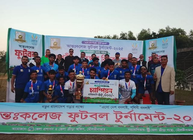 কমলগঞ্জ গন-মহা বিদালয় ফুটবল দনের(বার্সিনং ১৭) জামিল আহমদও মান অব ফাইনাল,বাংলাদেশ বিমানবাহিণীর শাহীন স্খুল এন্ড কলেজ ফুটবল দলের (জার্স নং ৪) লতিফুর রহমান। জেলা ক্রীড়া অফিসার মাজহারুল মজিদ,বাংলাদেশ ফুটবল ফেডারেশন মৌলভীবাজার জেলা শাখার রায়হান আহমদ,জেলা ক্রীড়া সংস্থার কর্মকর্তাসহ কলেজ শিক্ষক,রেফারী,কোচ ও খেলোয়াড়েরা উপস্থিত ছিলেন। পরে চ্যাম্পিয়ন দলের মাঝে প্রাইজমানি ৩৫ হাজার টাকা, মেডেল ও ট্রফি এবং রানারআপ দলের মাঝে প্রাইজমানি ২৫ হাজার টাকা,ট্রফি ও মেডেল প্রদান করা হয়। জেলা ক্রীড়া সংস্থার সহযোগীতায় অনুষ্ঠিত এ টূর্ণামেন্টে জেলার ৭টি উপজেলার ১২টি কলেজ ফুটবল দল অংশ নেয়। ফাইনালে বিজয়ী ও রানার আপ দল পরবর্তীতে বিভাগীয় ও জাতীয় পর্যায়ে অংশ নিবে বলে জানান জেলা ক্রীড়া অফিসার মাজহারুল মজিদ। এর আগে (৪ডিসেম্ভর) আন্ত: কলেজ ফুটবল টূর্ণামে›ন্টে উদ্বোধন করেন মৌলভীবজারের জেলা প্রশাসক তৌহিদুজ্জামান পাভেল ।