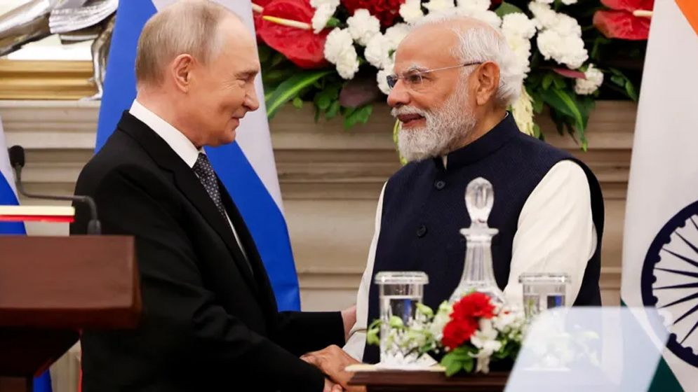দিল্লিতে এক সংবাদ সম্মেলনে ভারতের প্রধানমন্ত্রী নরেন্দ্র মোদির পাশে দাঁড়িয়ে যুক্তরাষ্ট্রের অবস্থানের তীব্র সমালোচনা করেন পুতিন। যেখানে ওয়াশিংটন নিজেই মস্কো থেকে পারমাণবিক জ্বালানি কিনছে, সেখানে ভারতের ওপর বিধিনিষেধের যৌক্তিকতা নিয়ে প্রশ্ন তোলেন তিনি।