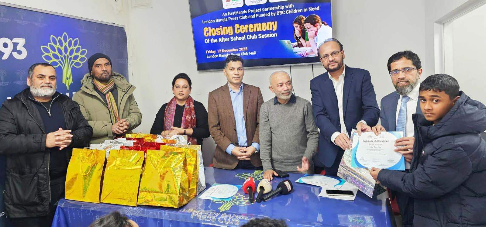 বিবিসি চিল্ড্রেন ইন নিডস-এর সহযোগিতায় লন্ডন বাংলা প্রেস ক্লাব ও ইস্ট হ্যাণ্ড চ্যারিটির উদ্যোগে পরিচালিত ৮ মাসব্যাপী আফটার স্কুল ক্লাব এডুকেশন সেশন সফলভাবে সম্পন্ন হয়েছে । এ উপলক্ষে ১২ ডিসেম্বর শুক্রবার সন্ধ্যায় প্রেস ক্লাব কার্যালয়ে এক সার্টিফিকেট প্রদান অনুষ্ঠান আয়োজন করা হয়।