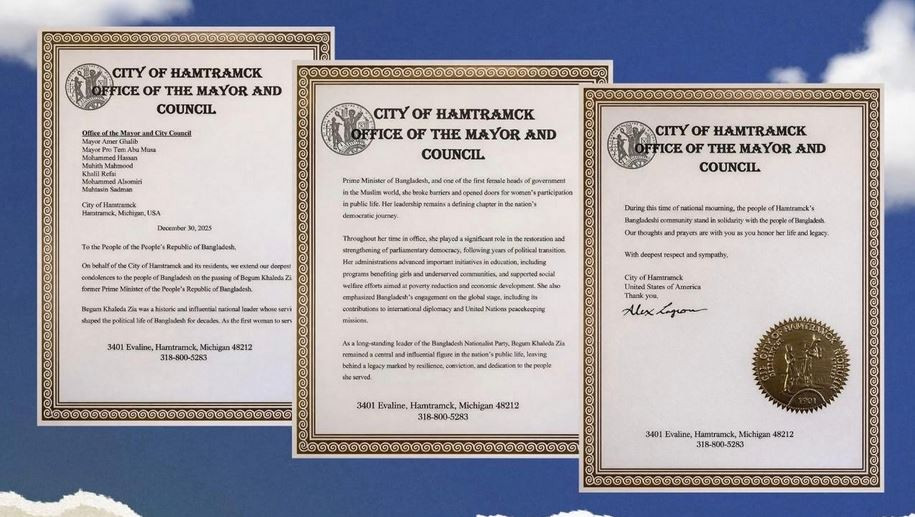 জিবি নিউজ প্রতিনিধি// যুক্তরাষ্ট্রের মিশিগান স্টেটের হ্যামট্রমিক সিটির ‘কারপেন্টার স্ট্রিট’ এখন থেকে ‘খালেদা জিয়া স্ট্রিট’ নামে নামকরণ করা হয়েছে। হ্যামট্রমিক সিটি কাউন্সিলে সদ্য প্রয়াত বিএনপি চেয়ারপারসন বেগম খালেদা জিয়ার সম্মানে এই নামকরণ করার সিদ্ধান্ত অনুমোদন পায় বলে জানিয়েছে বিএনপি মিডিয়া সেল।