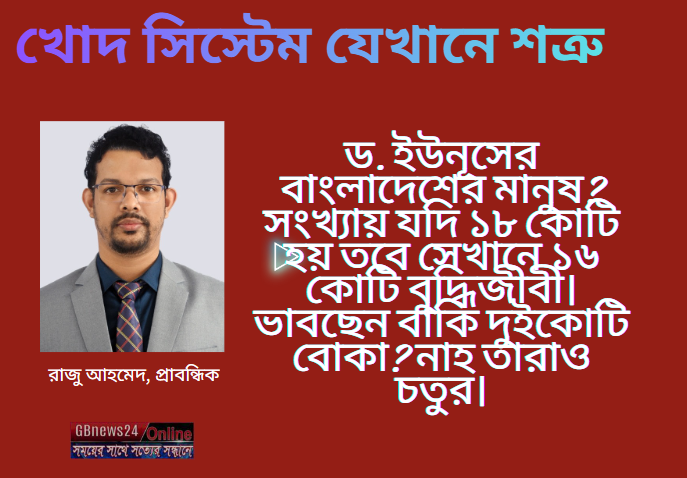 ড. ইউনূসের বাংলাদেশের মানুষ? সংখ্যায় যদি ১৮ কোটি হয় তবে সেখানে ১৬ কোটি বুদ্ধিজীবী। ভাবছেন বাকি দুইকোটি বোকা? নাহ তারাও চতুর। পৃথিবীর মধ্যে আর কোনো দেশে এতো ওয়াজ-মাহফিল হয় না, এতোবেশি মসজিদ-মন্দির কিংবা মাদ্রাসা নাই অথচ বাংলাদেশ? পথে পাঁচশো টাকা পড়ে থাকলে পাঁচশো মানুষ মালিকানা দাবি করবে। সুযোগ পেলে পাঁচ সেকেন্ডে সাগর হজম করে ফেলতে পারে। অনিয়ম দুর্নীতিতে বিগত কয়েক বছর এখানে পুকুরচুরি নয় বরং সাগরচুরি হয়েছে। লি-কুয়ান যে জনগণকে নিয়ে স্বপ্ন বাস্তবায়ন করতে পেরেছিলেন, বাংলাদেশের জনগণ সেই ক্যাটেগরির নয়। স্বার্থে আঘাত লাগলে ড. ইউনূসকে পানি দিয়ে এক ঢোকে গিলে ফেলতেও তারা দ্বিতীয়বার ভাববে না। ড. ইউনূস তো মানুষ, মেশিন দিয়েও এই জাতিকে সোজা রাখা আসলে সম্ভব কি-না সেটা গবেষণার বিষয়। পচন মস্তিষ্কের কেন্দ্র পর্যন্ত পৌঁছে গেছে।