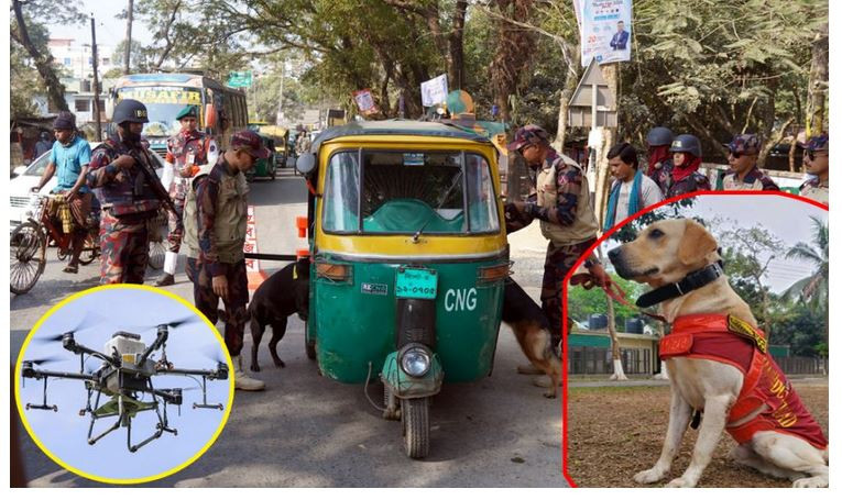 এ ছাড়া নির্বাচনী এই সময়ে সিলেটের সীমান্ত এলাকা দিয়ে অনুপ্রবেশ, মাদক ও অস্ত্র চোরাচালান রোধ বড় চ্যালেঞ্জ হয়ে দাঁড়িয়েছে। তবে এই চ্যালেঞ্জ মোকাবেলায় আগেভাগেই ব্যাপক প্রস্তুতি সেরে রেখেছে বিজিবি সিলেট সেক্টর। ভোটের দিন ঝুঁকিপূর্ণ কেন্দ্রগুলোতে ড্রোন উড়াবে বিজিবি। আর নিচে কাজ করবে প্রশিক্ষিত কুকুর অর্থাৎ ডগ স্কোয়াড। বিজিবি সিলেট সেক্টরের পক্ষ থেকে এমন তথ্য জানানো হয়েছে।